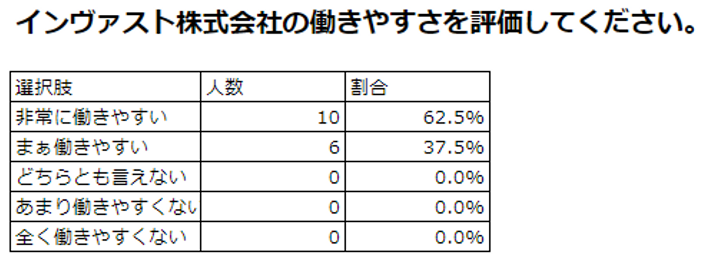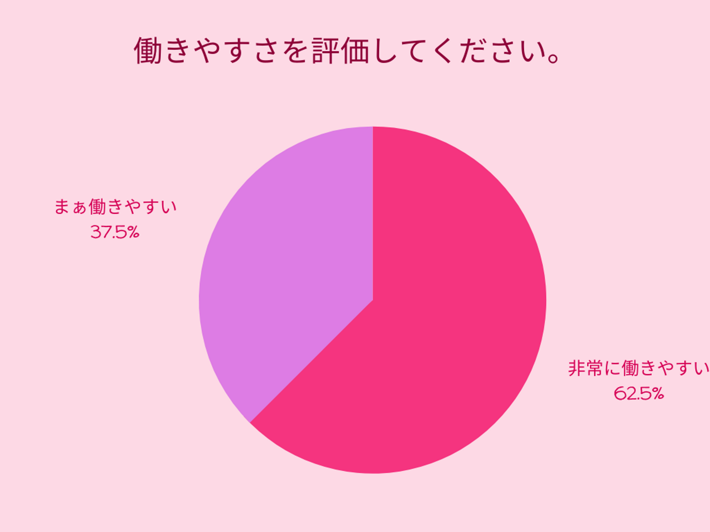 働きやすさについての設問では、全員が「働きやすい」と回答、さらに「非常に働きやすい」と最も高い評価がそのうちの62.5%を占める結果となりました。