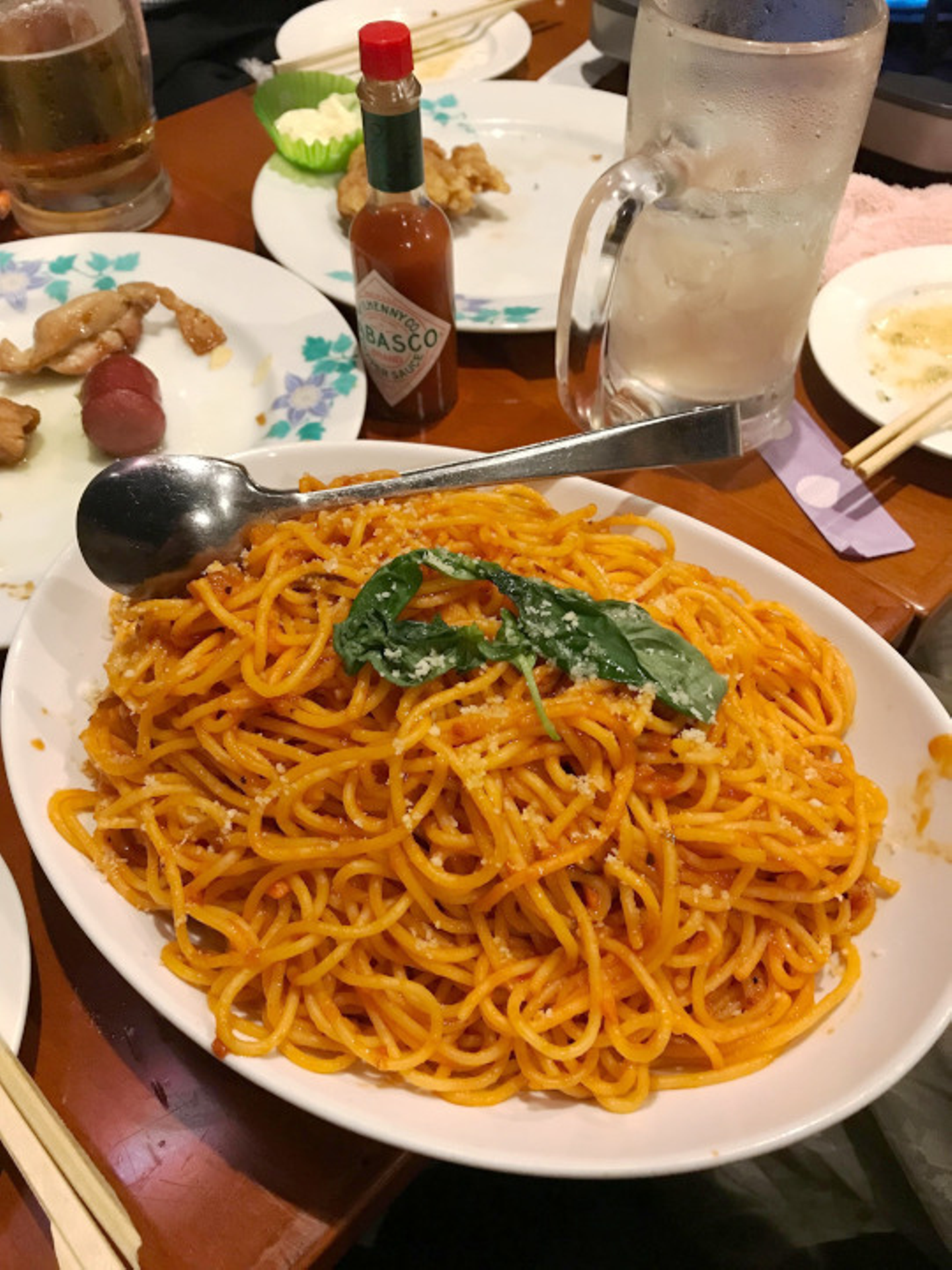 食べ放題といいつつも、一皿が追加を頼むのも大変なほどの量で、とてもオトク感があるお店です。ナポリタンがこのボリューム!大ジョッキと比べると、大きさがわかります。