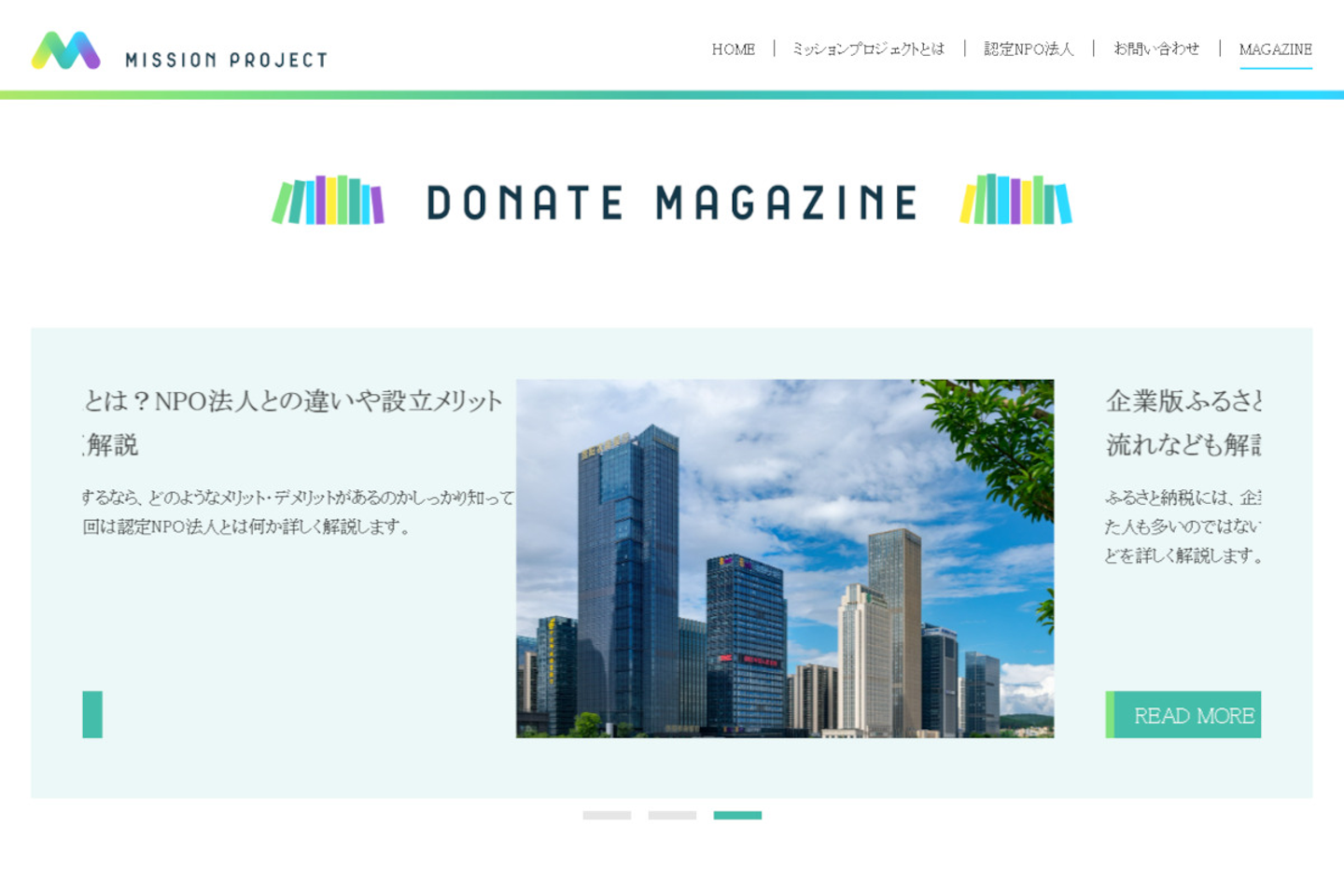「MISSION PROJECT」Webサイトでは、寄付や社会貢献に関する解説記事「DONATE MAGAZINE」も掲載しています。