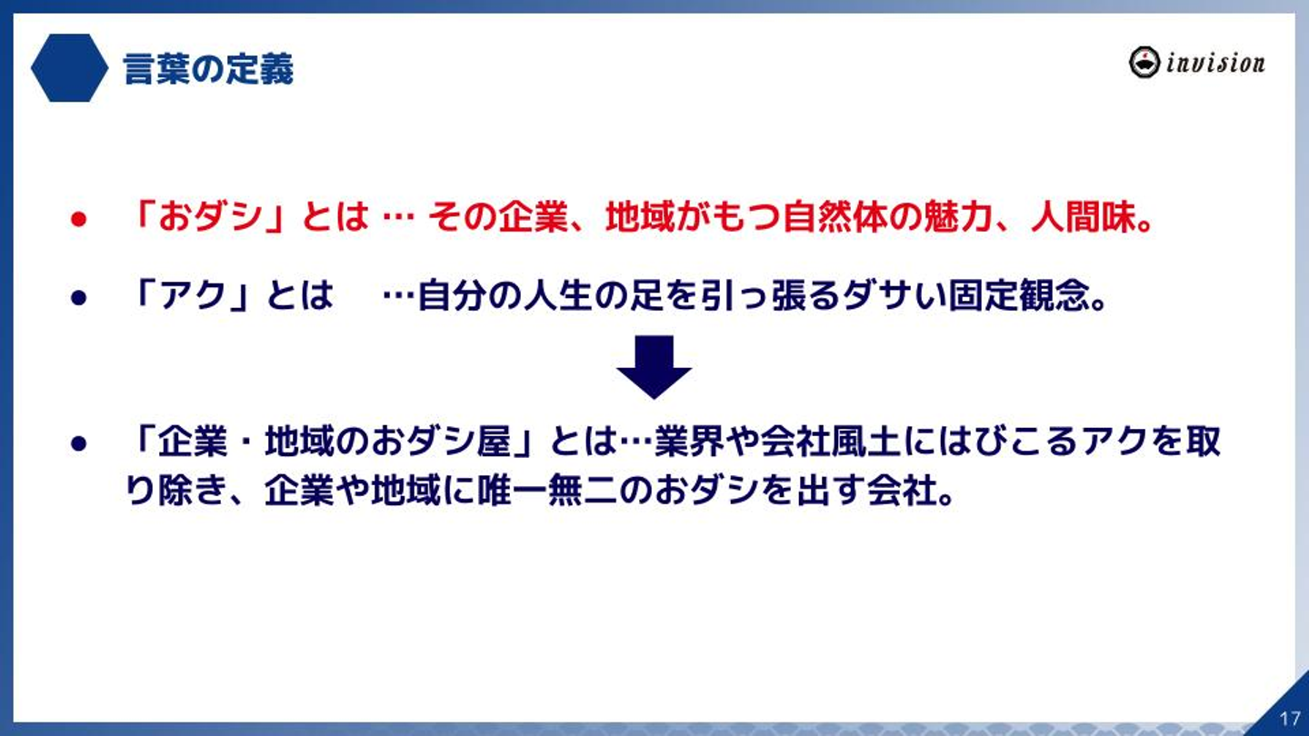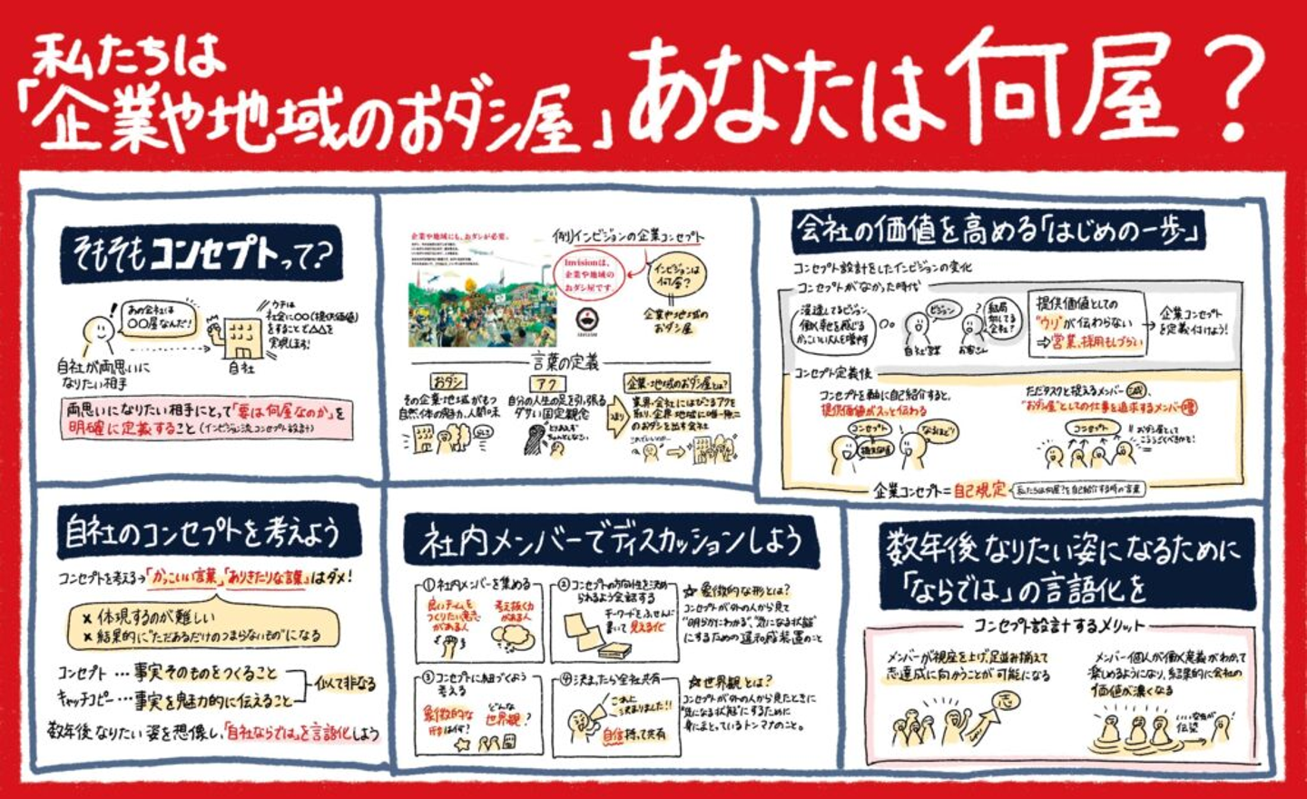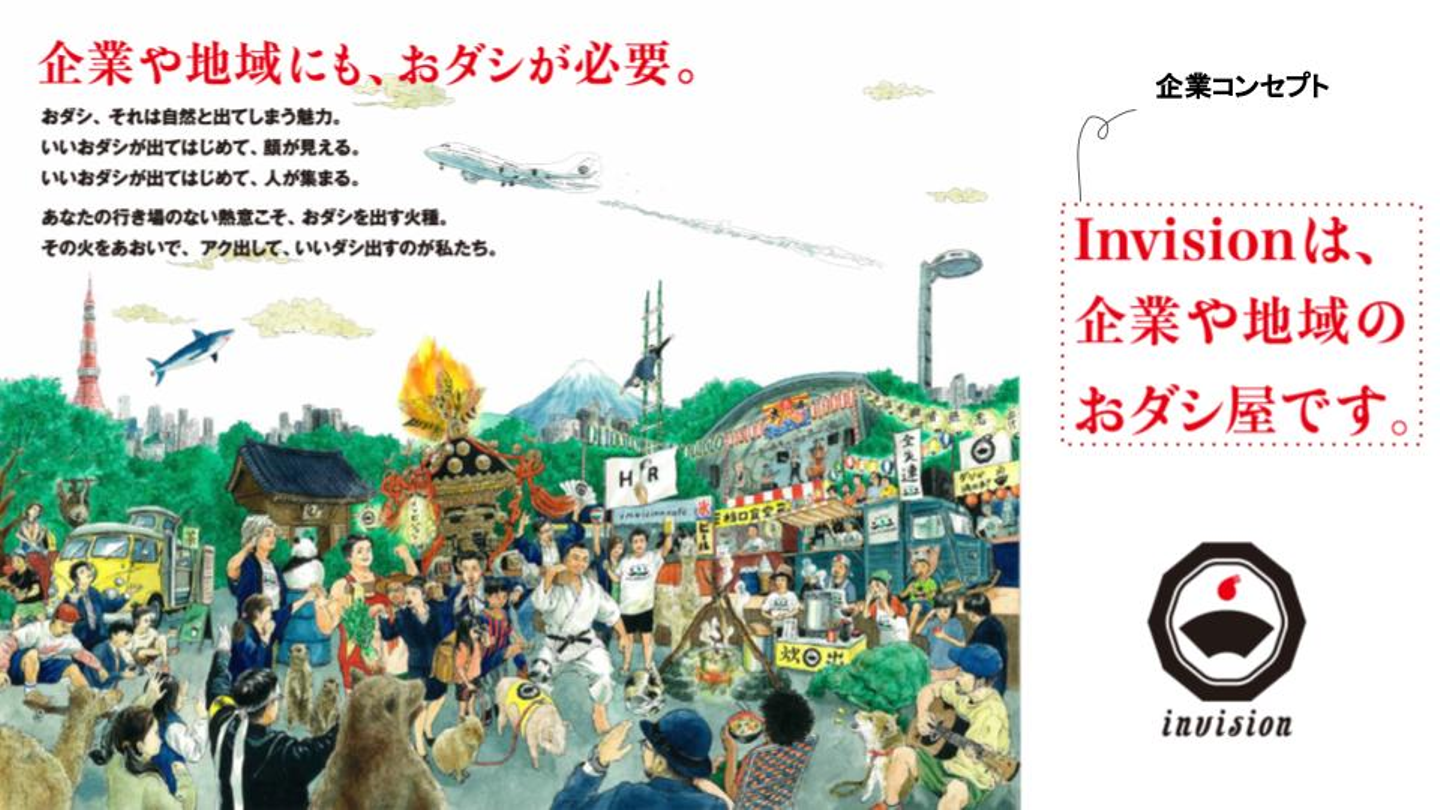定義したインビジョンの企業コンセプトは「企業や地域のおダシ屋」。