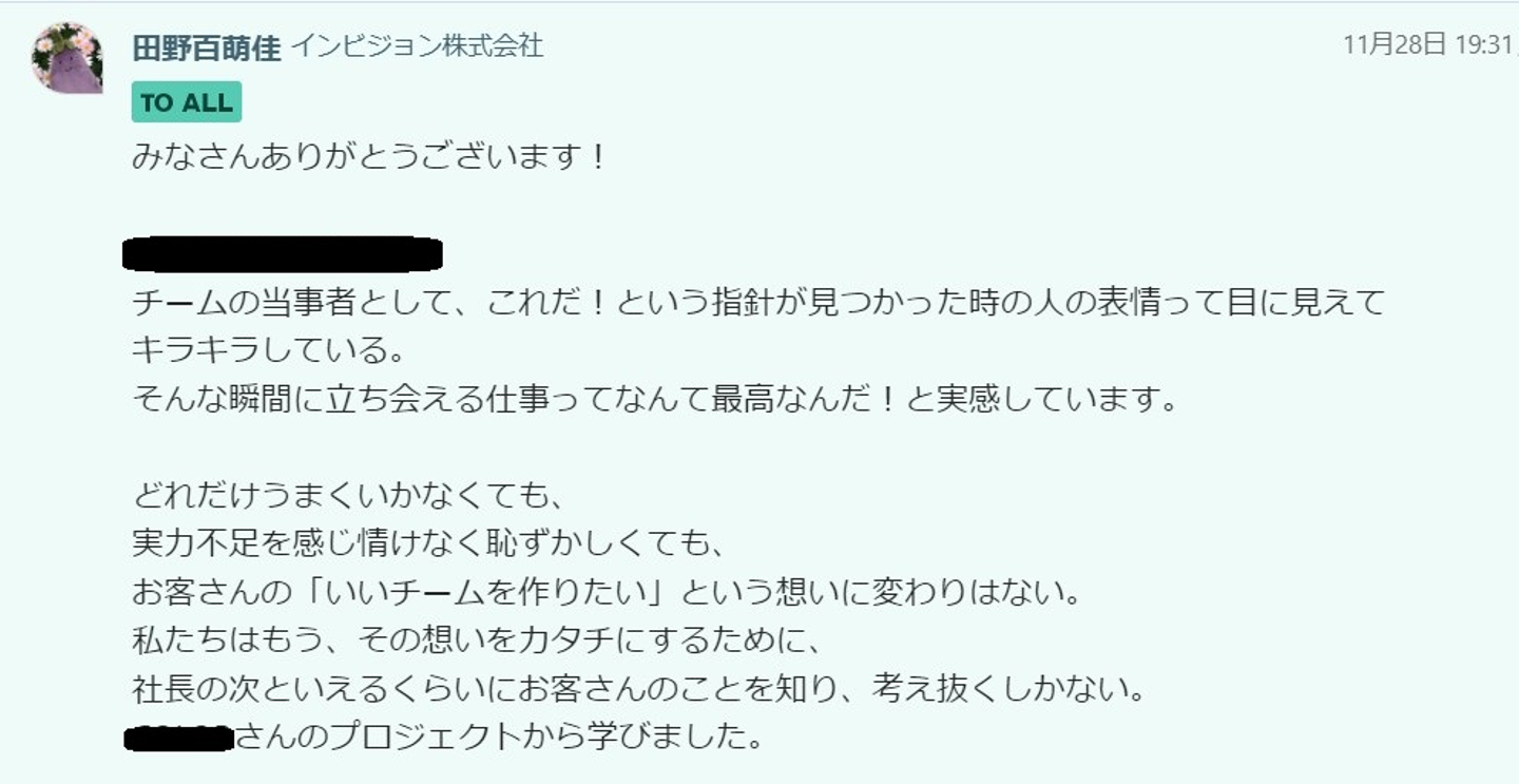 個人的に特に実感している価値がもう一つある。仕事をただのタスクと捉えるメンバーが激減/おダシ屋としての仕事を追求しようと考え動くメンバーが激増したこと。社内で飛び交うこういうチャットが大好物。嬉しくって何度も読んじゃう。
