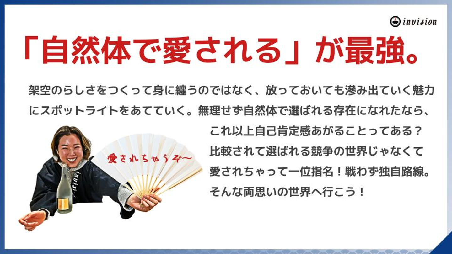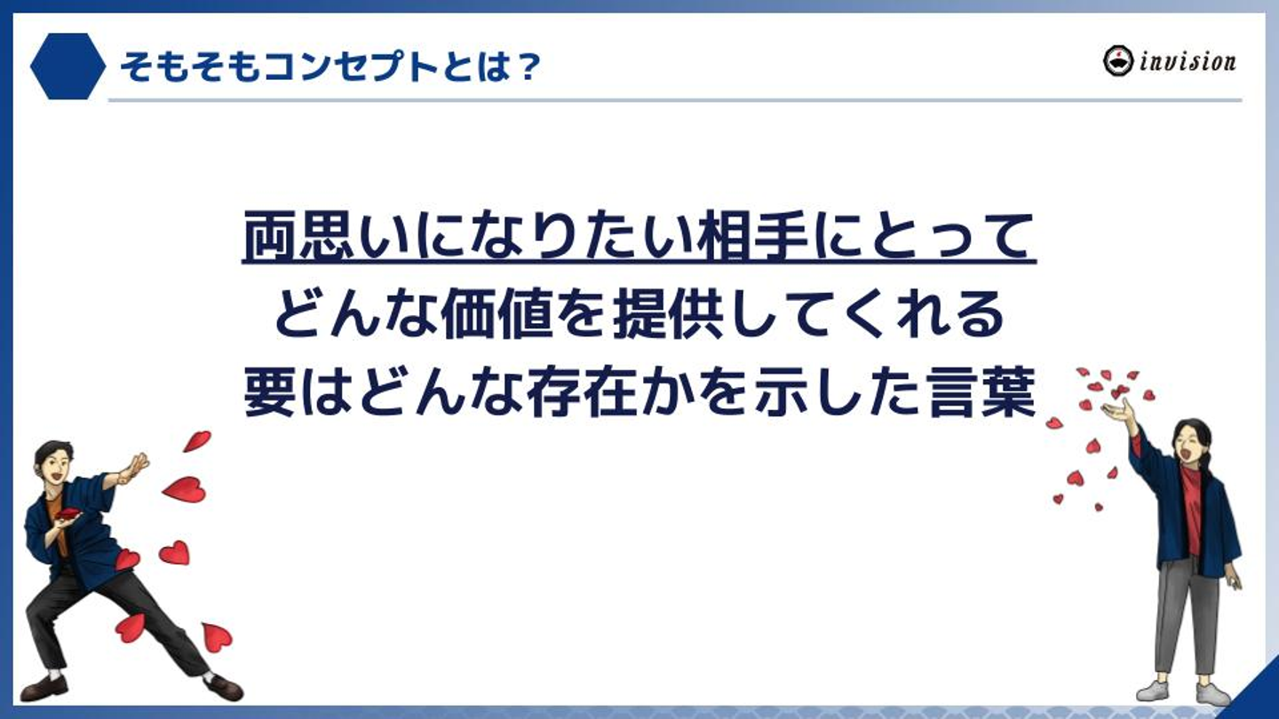 というように、”両思いになりたい相手にとって「要は何屋なのか」を明確に定義すること”がインビジョンで考えるコンセプト設計です。