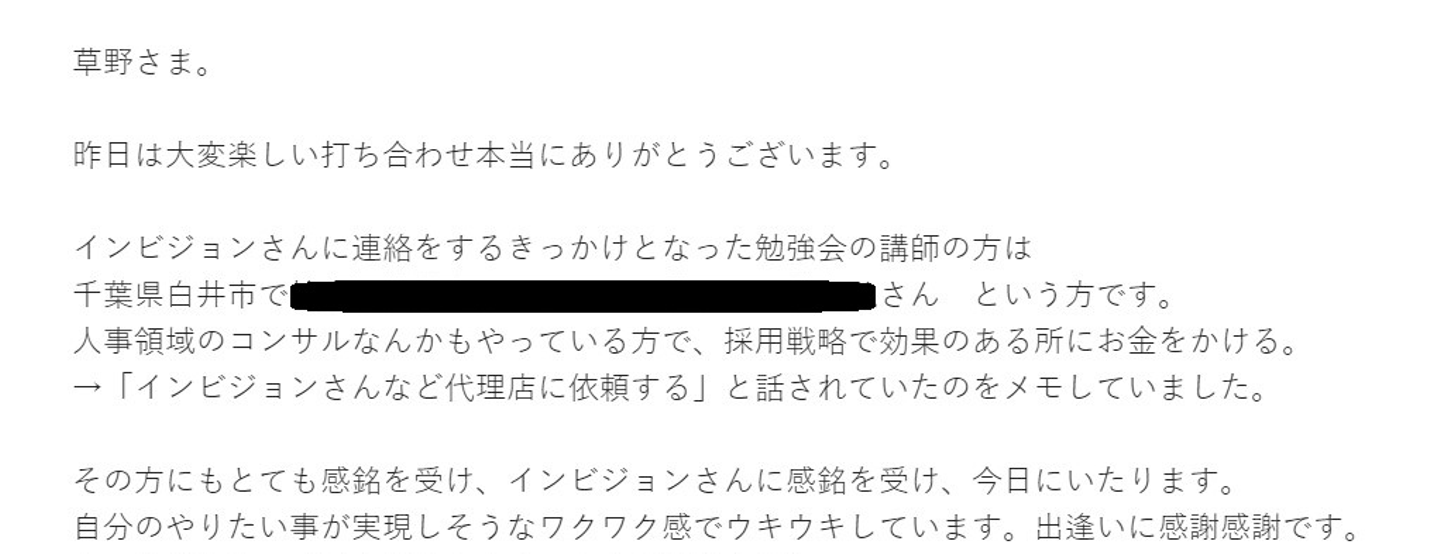 ▼営業メンバーが打合せ後にお客さまよりいただいたメール