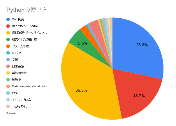 Pythonの使い方について、やはりデータサイエンスや機械学習をやるためにPythonを選択している方が多いです。 一方で、Web系の方も多く、Pythonの汎用性の高さを感じます。