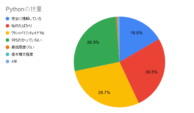 Pythonの技量について、これはノベルティのシールと関連した質問です。 「ワタシハパイソンチョットデキル」はインターネット上のスラングをもじった質問なのですが、文字通り「ちょっとできる」と解釈した方が多かったです。