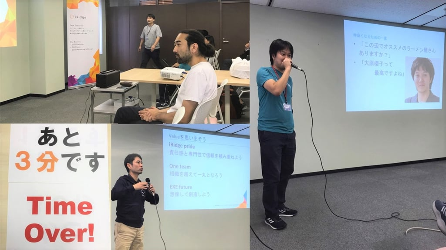 報告会では10月から新たにアイリッジの仲間入りをされた、キースミスワールドのみなさんの自己紹介や、上期の振り返り等、盛りだくさんの内容でした。分単位のアジェンダを進行するため、タイムキーパーも準備に余念がありません・・!(チンベルとタイムカードを用意して登壇者にお知らせしました)