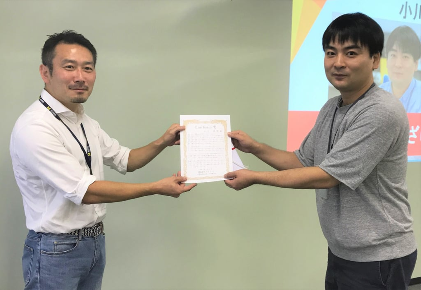 取締役の渡辺さん(左)から賞状を受け取る小川さん(右)
