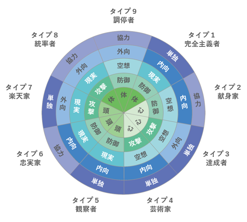ざっくり言うと、個人の気質や特性を9つのタイプに分けて分析するもので、あくまで疑似科学という見解もある一方、ビジネス管理の文脈で使われることも多い診断手法です。