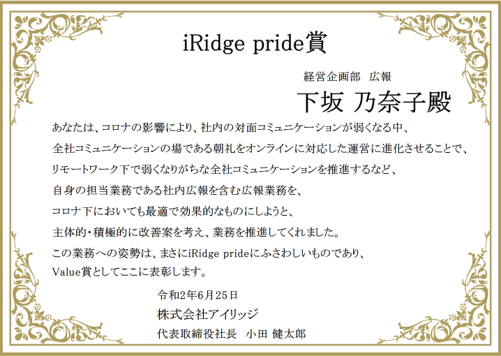 1人広報で悩む場面もたくさんありながら、アイリッジのために奮闘してくださっている下坂さんの受賞に、人事チームの感慨もひとしおでした。朝礼や月次報告会の準備など、下坂さんと一緒に全社コミュニケーション活動を進めてきましたが、改めて下坂さんの仕事に対する熱意や志を少しでも伺えてハッピーでした!