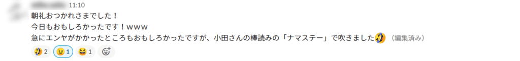 あと、小田さんが最後の締めの挨拶の時に、朝礼のコンテンツから汲み取ってコメントをアレンジしてくれるのが、毎回じわっと来ます。笑 リモートの朝礼だと最後手を振ってくれたり。けしてそういうのが得意なタイプじゃないのに、小田さんなりにみんなとコミュニケーションを取ろうとしてくれているのを感じるようになりました。