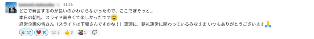 ニュース番組風の朝礼を初めて実施した時、#randomのチャネルでもらえたコメントが、リモートならではの工夫を認めてもらえた気がしてとってもうれしかったですよね。