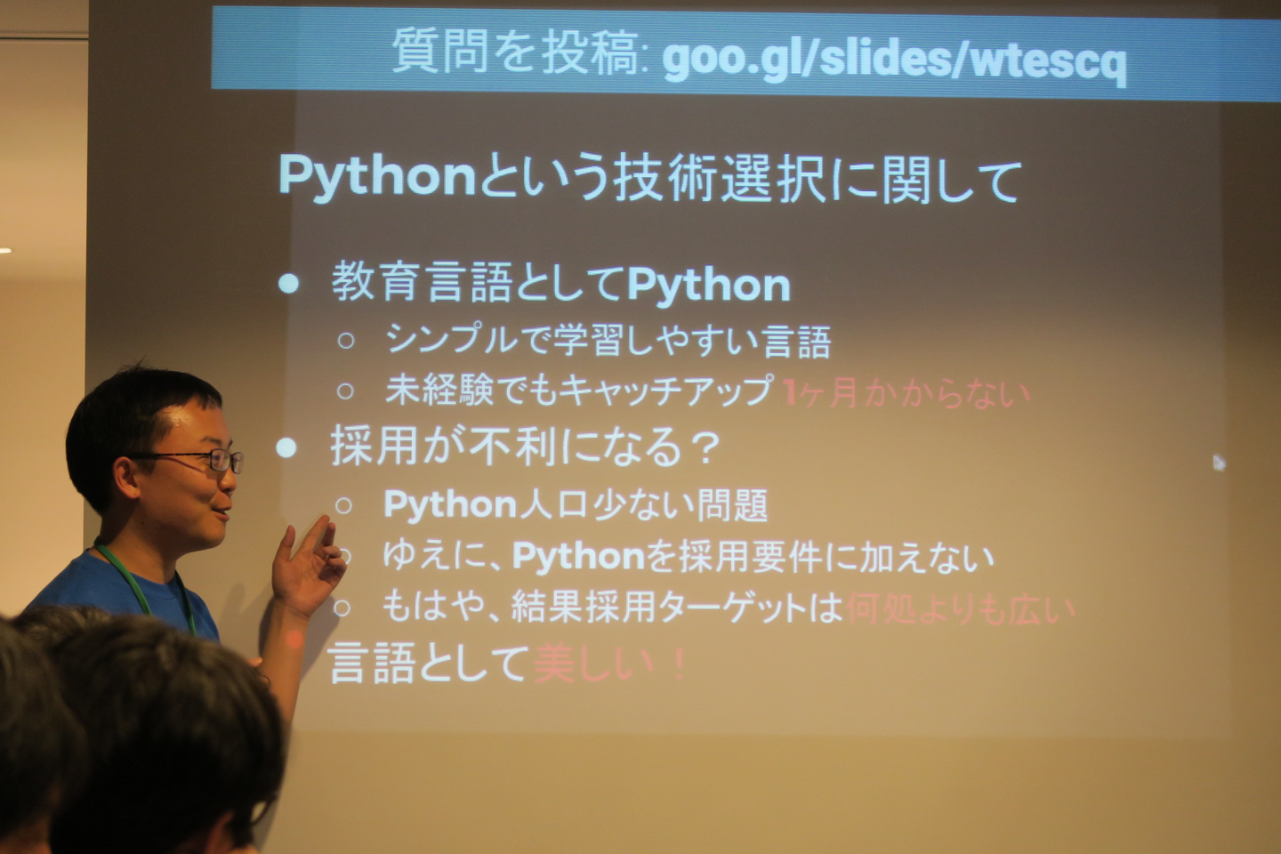 Pythonという技術選択を何故したかなどはかなり具体的で、特に、第三のポイントとして挙げている「言語として美しい!」は花村さんのこだわりを感じました(笑)