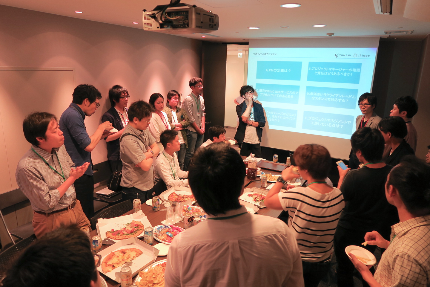 既に予定時刻を大幅に過ぎていたため、ピザや追加のドリンクを入れて賑やかな雰囲気でパネルディスカッションを行いました。事前アンケートでいただいたご質問を基に、ゆめみの工藤様がファシリテーターとして、参加いただいた皆様と登壇したPMをで議論を広げて行きました。そのまま、規定の時間までパネルディスカッションを行い、懇親会に移行しましたが最後まで盛況でした。