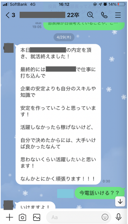 ※学生さんが企業さんに内定承諾をした時に報告してくれた時のLINE文面です。(掲載許可頂いています)