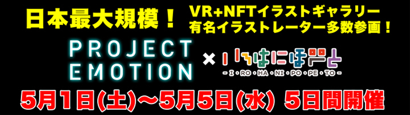 常識の斜め上をイくオタク系クリエイター集団:株式会社いろはにぽぺと(本社:東京都渋谷区 代表取締役:渡辺圭広 http://irohanipopeto.com )は、NFTアートを360°VRギャラリー内に展示し『日本のイラストカルチャー』をNFTによって盛り上げる「PROJECT EMOTION(プロジェクトエモーション)」に協賛いたします。