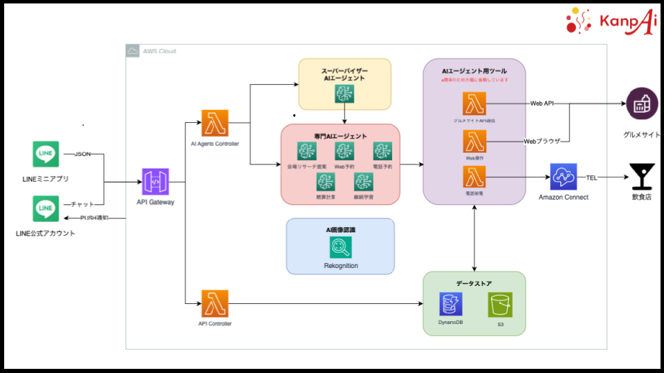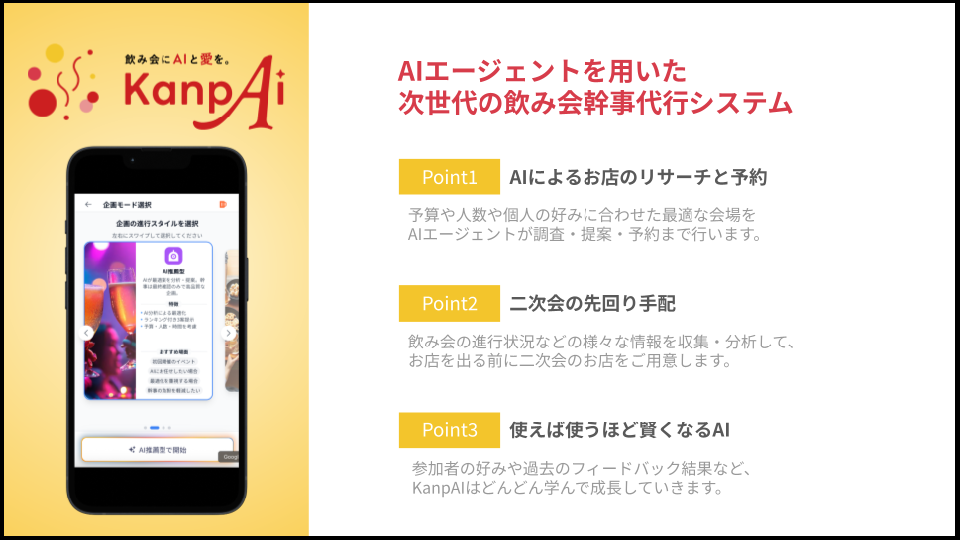 藤本さん: 今回のハッカソンは、業務ではなく部活動的な取り組みだったので、参加する自分たちが楽しめるテーマを選びました。WhiteBox開発チームが大好きなお酒に関する課題点を考えた時に、それをまるっと解決してくれるスーパーマンが発想の原点です。KanpAiは、LINEミニアプリとAIチャットを通じて、お店の予約から飲み会後の精算まで、全ての仕事をAIが参加者に寄り添いながら代行してくれます。