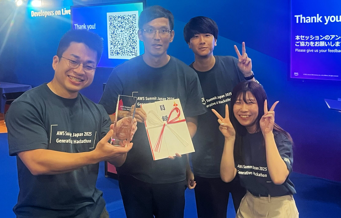 末永さん: ありがとうございます!率直な感想は、AWSさんに招待いただいた次のイベントがラスベガスで行われるので、軍資金をいくらにしようか悩むなっていう感じですね(笑)KanpAiは飲み会の幹事業務に特化したアプリで、特別な知識もいらず、AIに関する知見は全員が一定持っていたので、興味がある分野で担当分けしました。