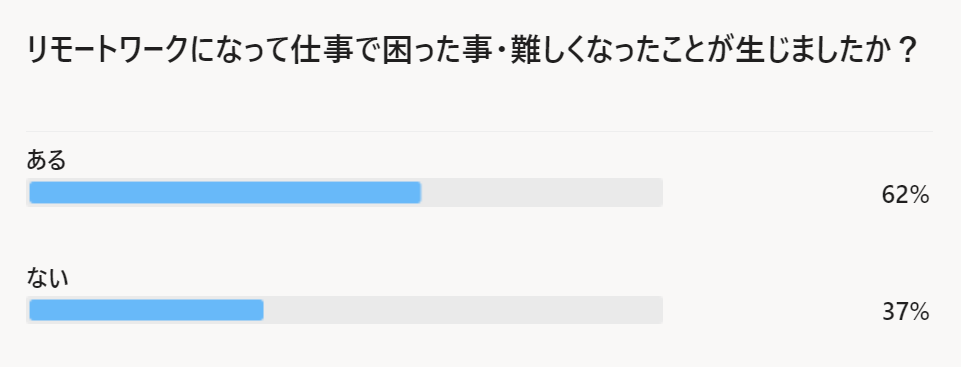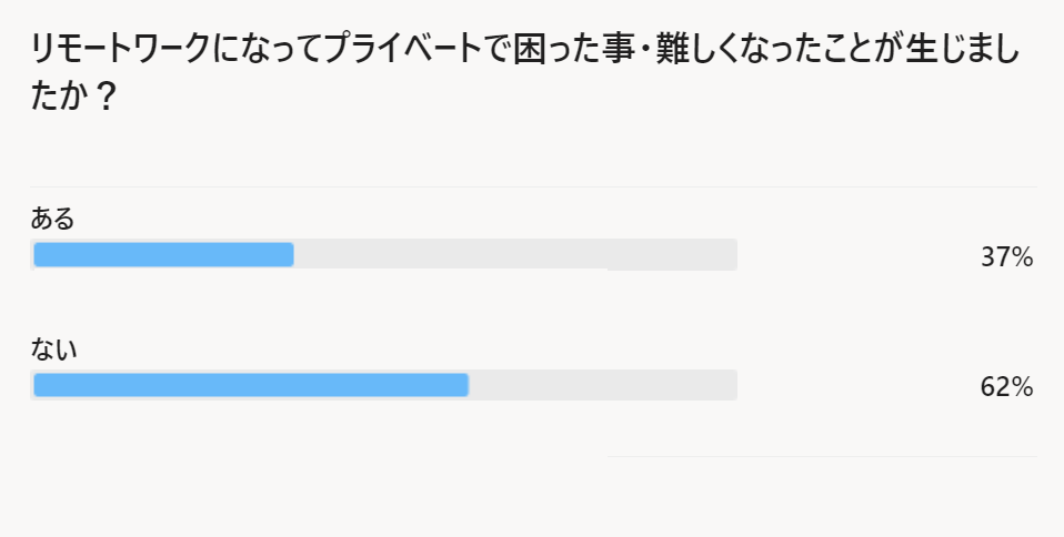 リモートワークと聞くと、「仕事もプライベートも100%充実する」、「自分らしいスタイルで仕事が出来る」いったイメージも強いですが、一方リモートワーク勤務になったことで困った事や難しくなったことが増えたと回答したメンバーは37%と予想外の数字が出ました!