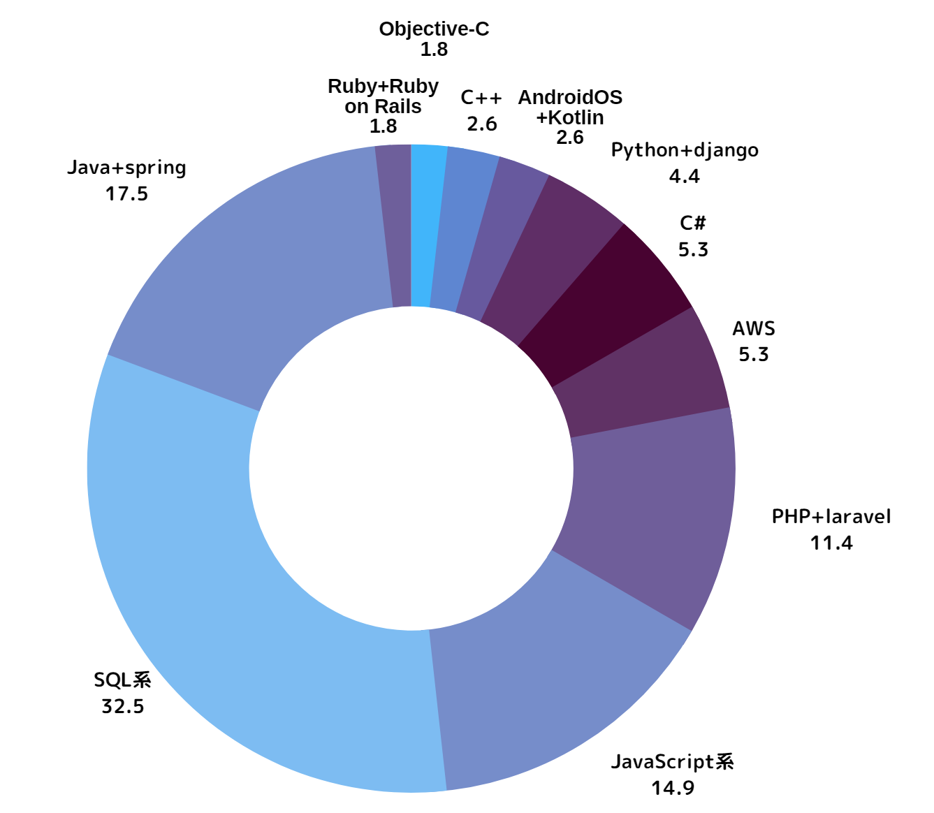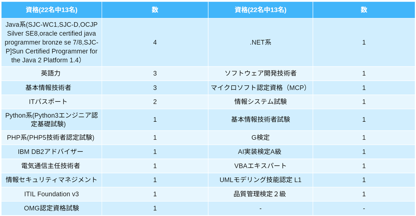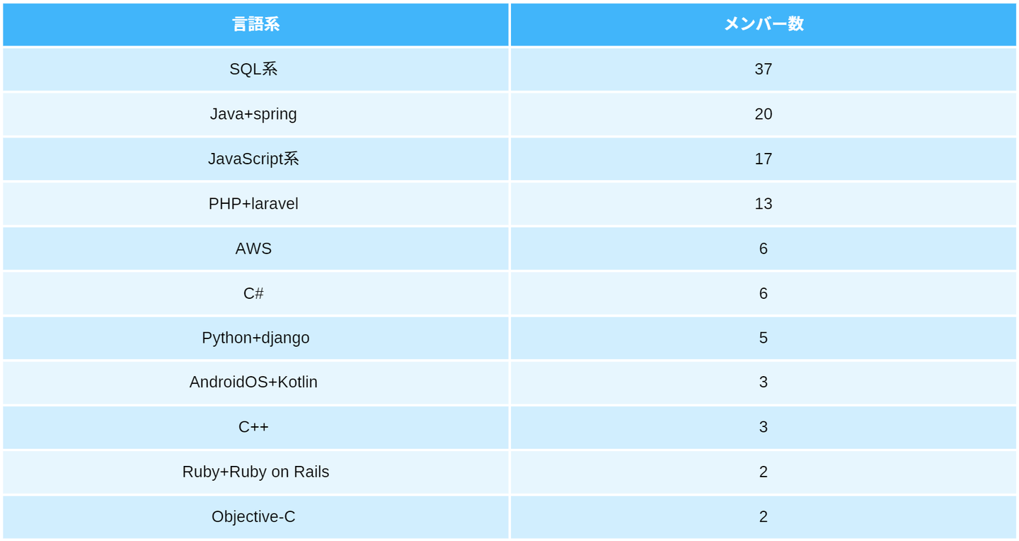 こうやってみますと、やはりクライアントニーズの高いJava+SpringやPHP+Laravel、そしてSQL系もスキルとして取得しているメンバーが多いことがわかりました。