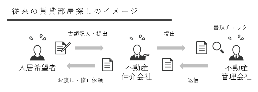 この3者間には電話やFAX、メールを用いた煩雑なやり取りが未だ多く存在しており、入居希望者にとっては、物件ポータルサイトなどを見て問い合わせをしても、既にその物件が埋まってしまっていたり、内見の予約に手間がかかったり、手書きで多くの申込書に記入をしなければならないという不便さがありました。