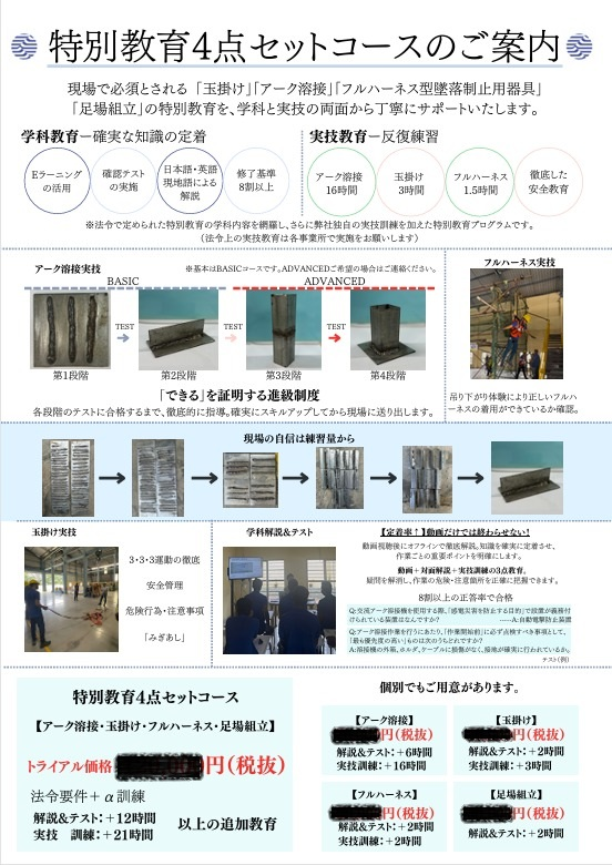 藤田:この授業で習得できるスキルは、建設現場で必須とされる「玉掛け」「アーク溶接」「フルハーネス型墜落制止用器具」「足場組立」になります。この4つのスキルを資格取得レベルまで引き上げることを目的とした「特別教育4点セットコース」を教育メニューとして形にしました。