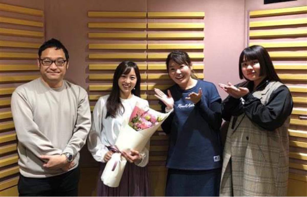 ラジオ番組「イノベーターズ・クロス」収録見学の様子(左から、いつも.取締役副社長 望月智之、ホリプロ所属 アナウンサー 高橋茉奈氏、いつも.広報 うえむら、Tさん)
