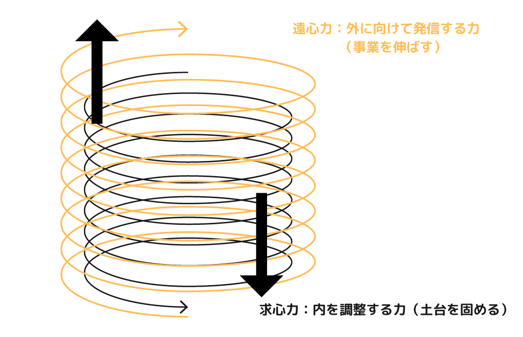 求心力と遠心力で考えると分かりやすいと思うんだけど、企業を外に伸ばしていく力を遠心力、企業の中を作っていく力を求心力って考えた時に、企業はやっぱり会社を成長させていかなきゃいけないから、基本的にはみんな外を向いてるんだよね。もちろん、これは当たり前のことなんだけど、中を振り返らなかったら、気付いたら全員バラバラな方向に向いていたっていうことが起こる。この「振り返る」タイミングは今来てるのかなっていうのは思うよね。