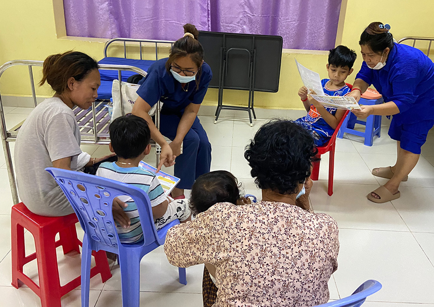 【スクリーニングを実施した後には、ティラ栄養士による集団の栄養教室を実施しています。カンボジアのフードピラミッドを使って食品の分類を学んだり、付き添い家族の方に患者さんの食事内容の記録をお願いしているので、書き方のレクチャーを行っています。】
