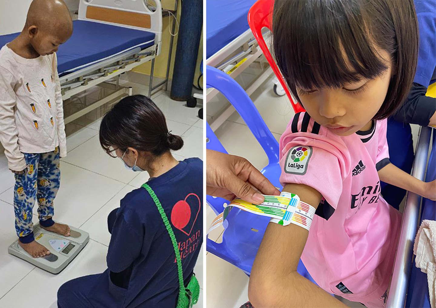 【左:体重測定 右:上腕周囲長の測定】