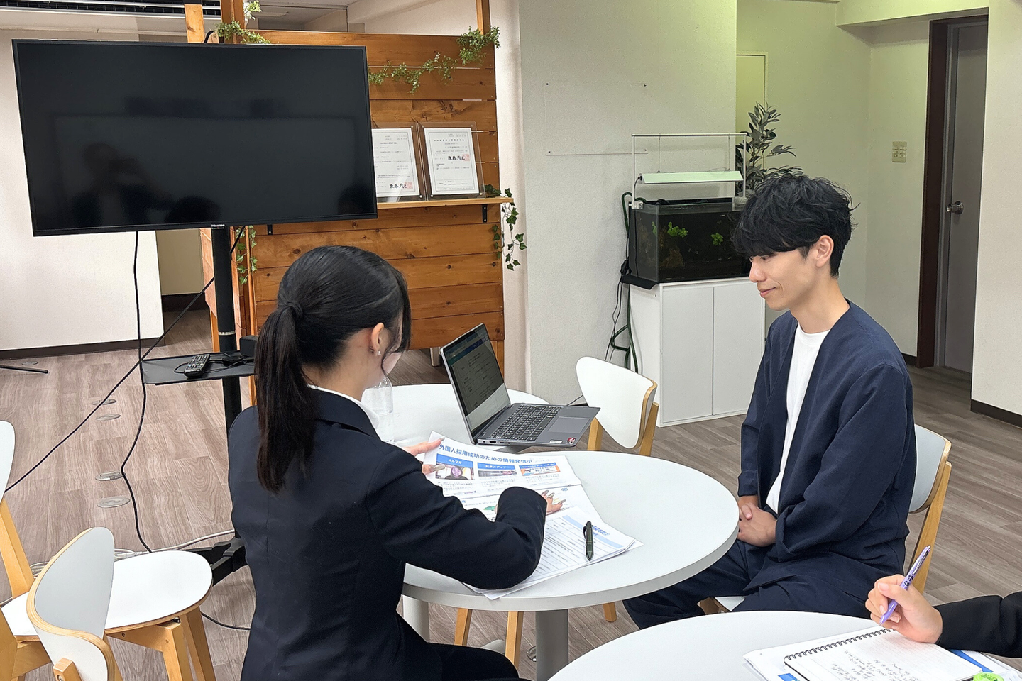 模擬商談に向けて、インターン参加者の間で商談の進め方、質問への対応の仕方などを話し合っていただきました。JJS社員が見守り、ときどき声掛けやアドバイス等を行いながら、入念に準備をしていただきました!