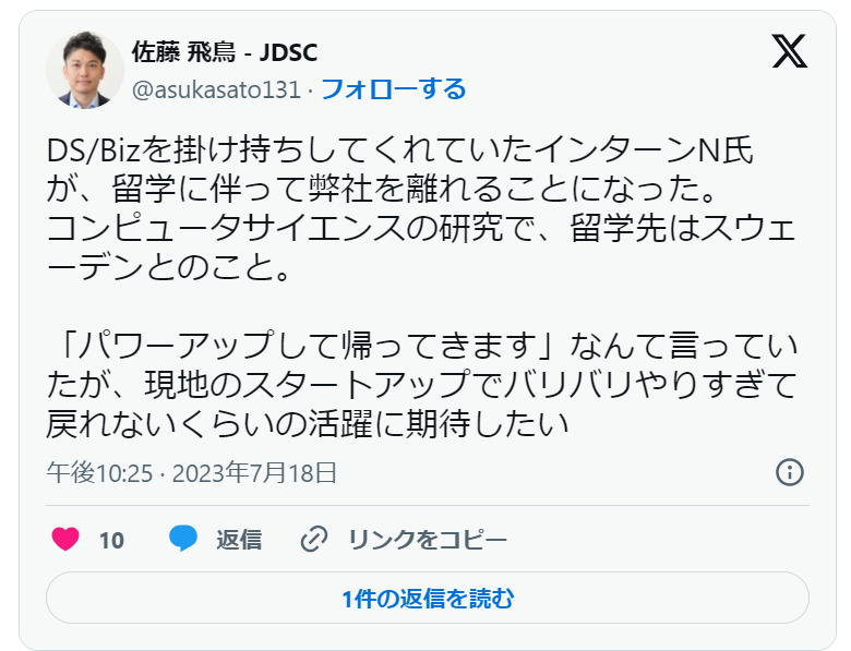 2023年8月からスウェーデンへ留学にいく都合で、一度JDSCから離れることになりました。執行役員の佐藤さんにも快く送り出していただきました↓
