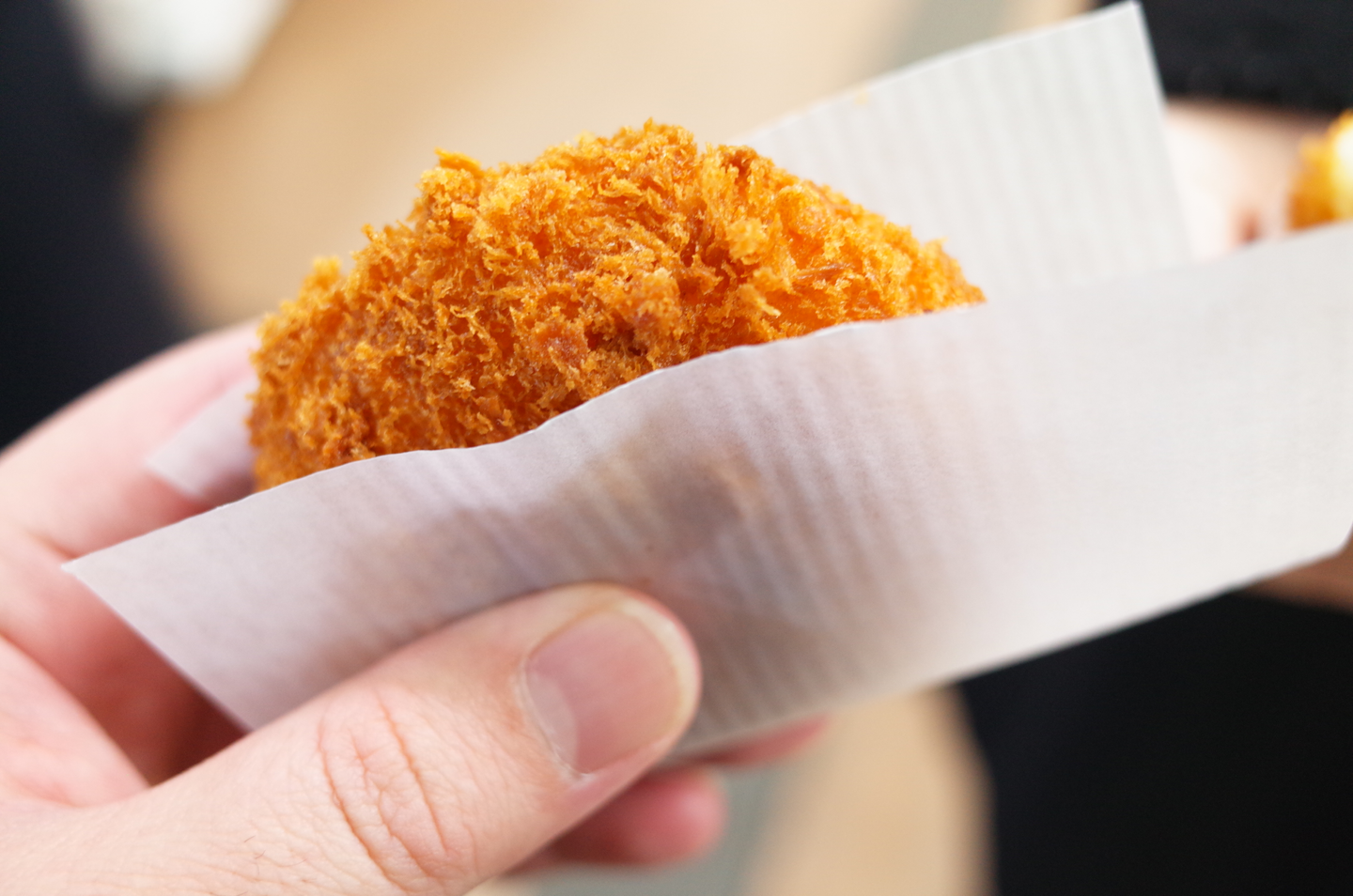 |斎藤惣菜店さんの揚げたてコロッケ(65円)、素朴な甘みが優しい、そしてやっぱり揚げたてはうまい。