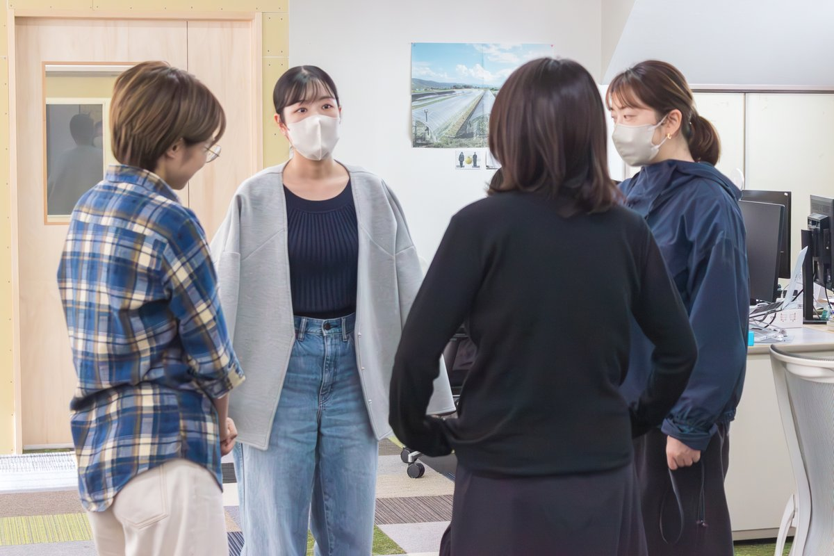 地元カンパニーでは、みんなで輪になって思っていることや考えていることをお互い話していく朝会を続けています。私が入社した8年前は、フリートークのようなかたちで、それぞれが思い思いに話していたけれど、近年は行動様式を踏まえたテーマで会話するように。そうした取り組みもあって、だんだん地元カンパニーの哲学が社内に浸透していっていると思います。