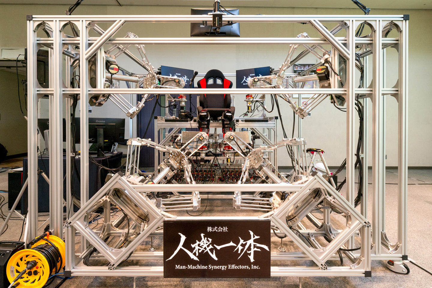 人機一体社が提唱するマンマシンシナジーエフェクタ(人間機械相乗効果器)としての、人型重機の試作機を展示します。ここでは、上記の独自技術により、マスタ(操作者)からスレーブ(ロボット)への操作だけでなく、スレーブ側からもマスタ側へ信号が伝えられており、操作者が直感的に動かすことができます。
