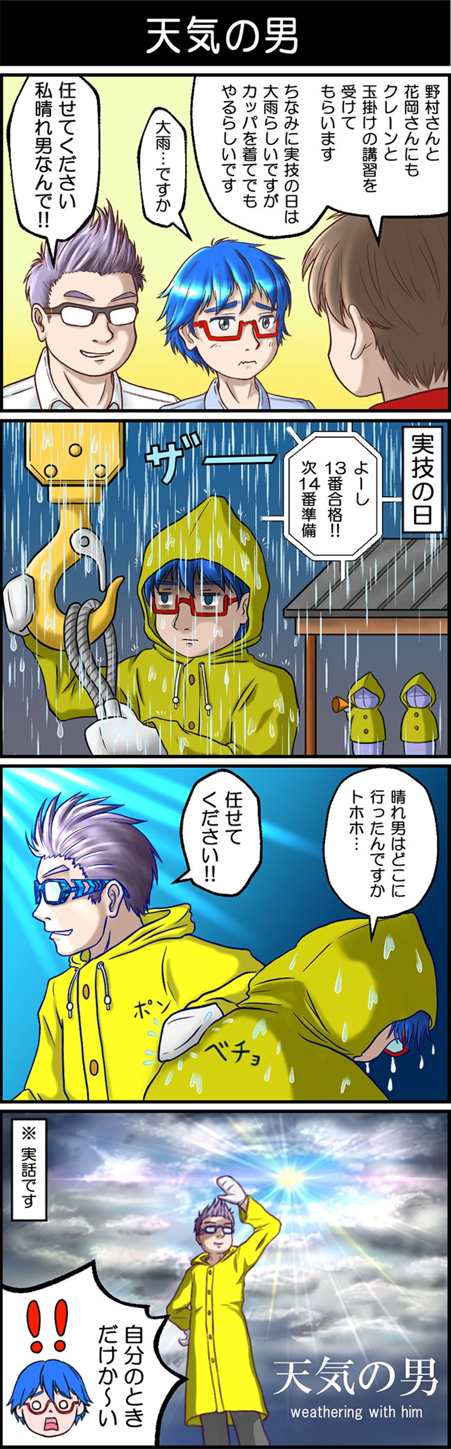 株式会社人機一体Followhttp://www.jinki.jp滋賀県FollowHomeAbout usMembersStoriesJob postings 人機四コマ vol.14:天気の男 Akiko Terunaga Morooka, 野村 方哉 and 1 others Business (Finance, HR etc.), Engineer/programmer Akiko Terunaga Morooka 株式会社人機一体 / Business (Finance, HR etc.) Follow 野村 方哉 Engineer/programmer Follow Hirokuni Hanaoka Engineer/programmer Follow on 2020-12-21 今回の話は 株式会社リバネス の定期刊行冊子『創業応援』2019 年 12 月号に掲載されています。今日は、「天気の男」。前回の玉掛講習の続きです!!他の四コマを読みたい方は、株式会社人機一体の公式ウェブサイト 人機ウェブへどうぞ! 人機四コマ vol.14:天気の男 Akiko Terunaga Morooka 株式会社人機一体 / Business (Finance, HR etc.) ロボット エンジニア スキルアップ Share