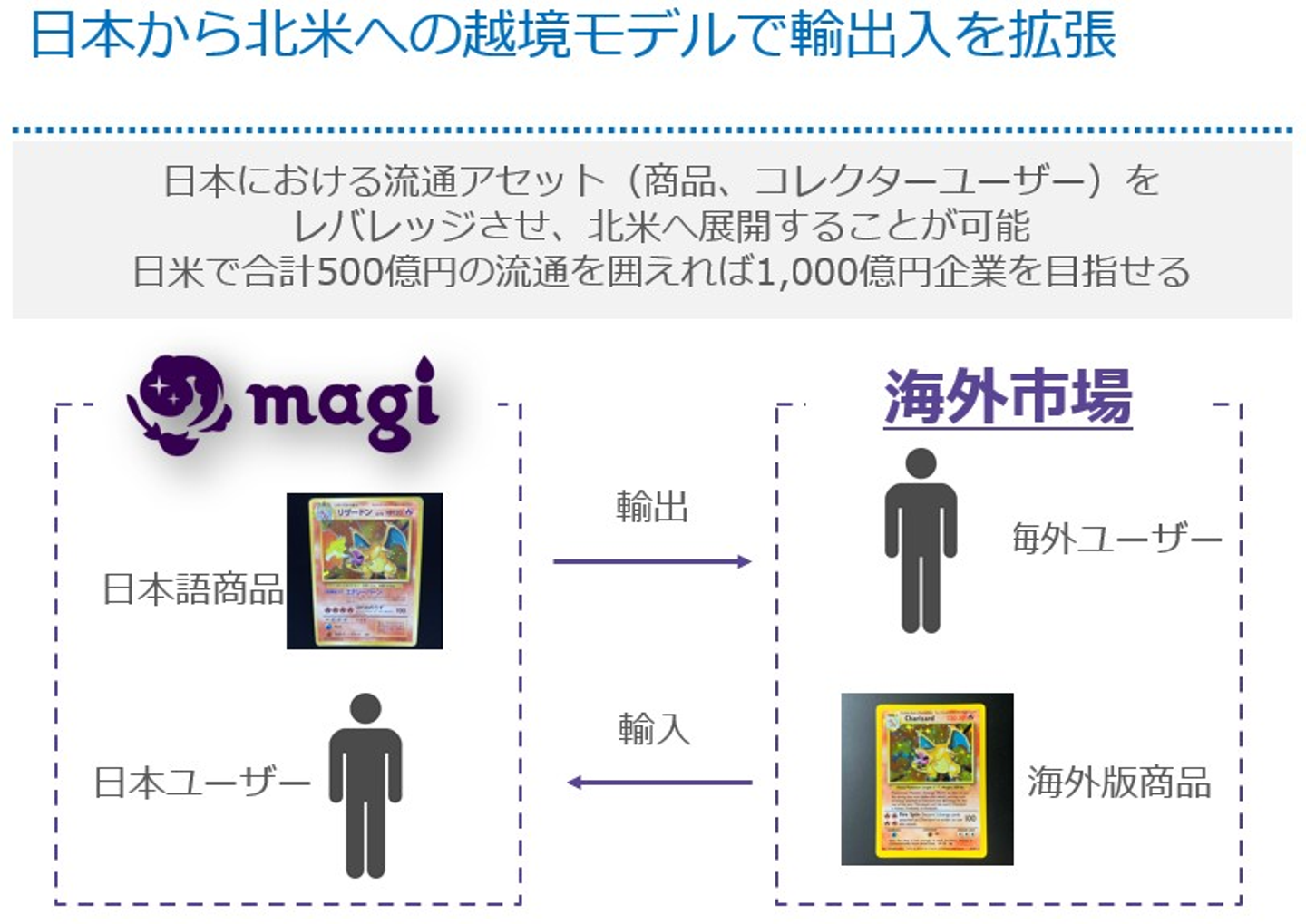 ここで言う流通力という言葉の定義はふわっとしたものですが、より早く供給できる、より安く供給できるなどの意味合いを含みます。日本の店舗も持つ会社が発送しているとなれば信頼もされやすいでしょう。現状は個人レベルが運営している海外向け通販サイトばかりという状況なのです。また、このような海外展開の際に失敗する企業は多数存在しますが、弊社の場合は日本語版のトレーディングカードを海外に対して専門的に売り買いするという市場の切り分け方をした上でスタートするため、非常にニッチで尖ったマーケティング訴求ができる状態で参入することになります。このような尖ったマーケティングの仕方自体が失敗する確率を下げてくれるものだと考えます。我々は既に日本のコレクター、日本語版の出品という流通アセットを有しております。これから、まずは日本から海外への越境マーケティングに取り組んでいきます。