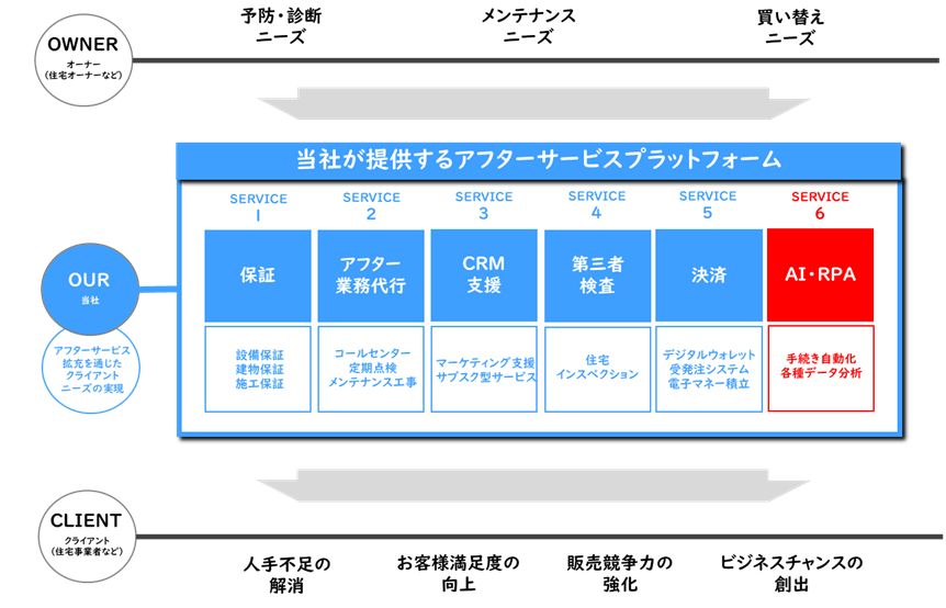当社では、これまで独自の「アフターサービスプラットフォーム(下図参照)」の提供を通じて、3,500 社を超える住宅事業者にアフタ ーサービス拡充を通じた経営支援を行ってまいりました。その中で、未だに紙文化が根強く残る住宅業界の現状に大きな課題を感じ ており、その解決に向けたソリューション提供を模索していた状況でした。 一方、ネットスマイルは AI・RPA の開発・導入サポートを得意とし、これまでに数百社以上への製品導入・コンサルティング実績を 持つ先端テクノロジー企業であり、既に不動産テック領域でも、AI 業務自動化ソリューションを提供し、業務効率化に大きく貢献した 実績もあります。 今後、両社の強みを融合し、中小工務店など裾野の広い住宅業界のデジタルトランスフォーメーションを力強く推進していくことを目的 に、この度の資本業務提携に至りました。