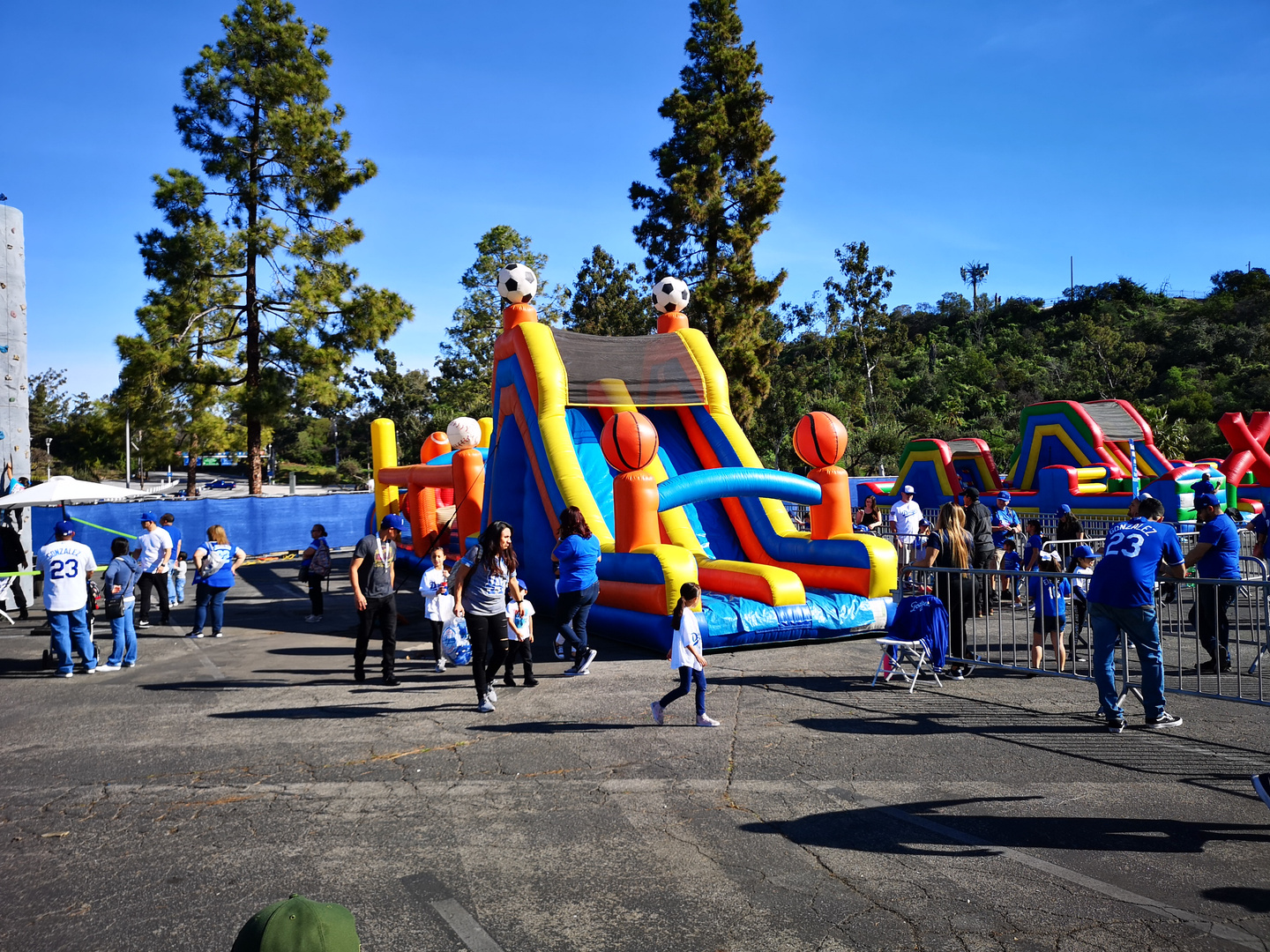 球場外の駐車場エリアには選手と写真が撮れるブースをはじめ、ボルダリングや巨大な滑り台などの子ども向けアクティブコンテンツ、スポンサー企業のブース、他競技チームのブースなどが立ち並びます。