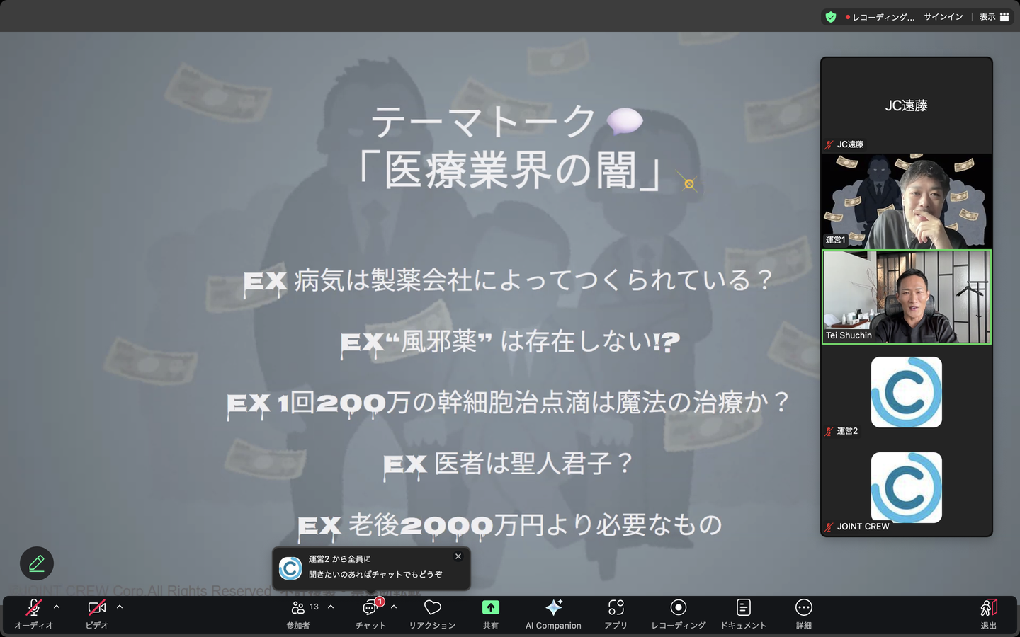 今回のテーマは「医療業界の闇」。真夏の8月開催だったこともあり、運営が用意してくれたホラー風イラストがより一層の盛り上がりを演出していました。