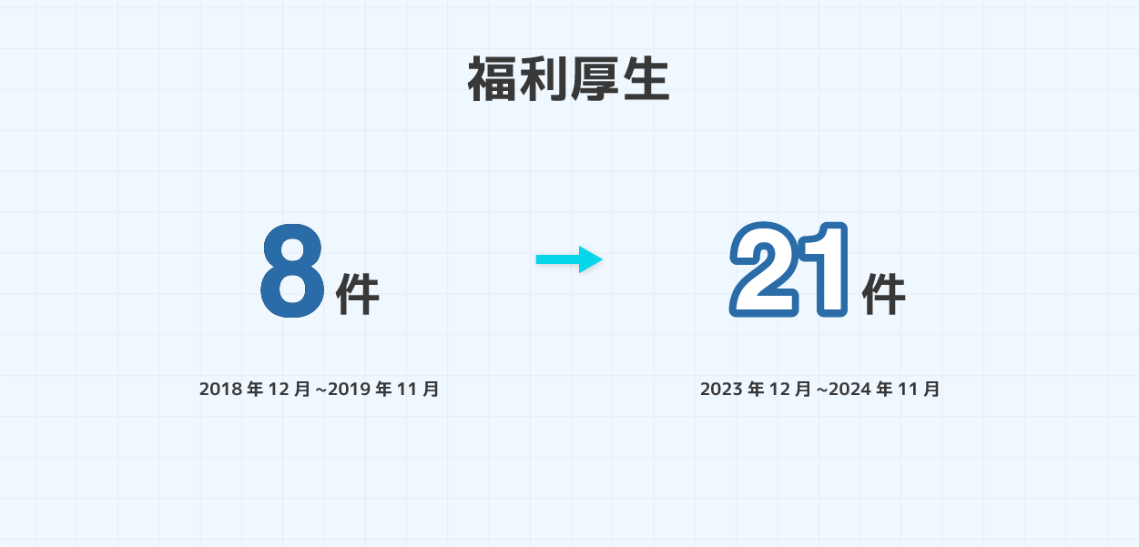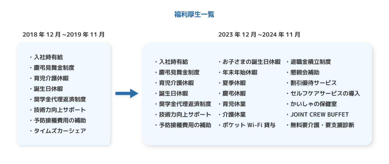 社員がより安心して働ける環境づくりを目指し、福利厚生の数もこの5年間で2倍以上に増えました!