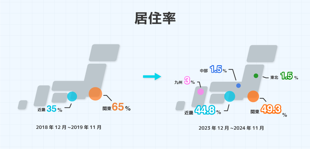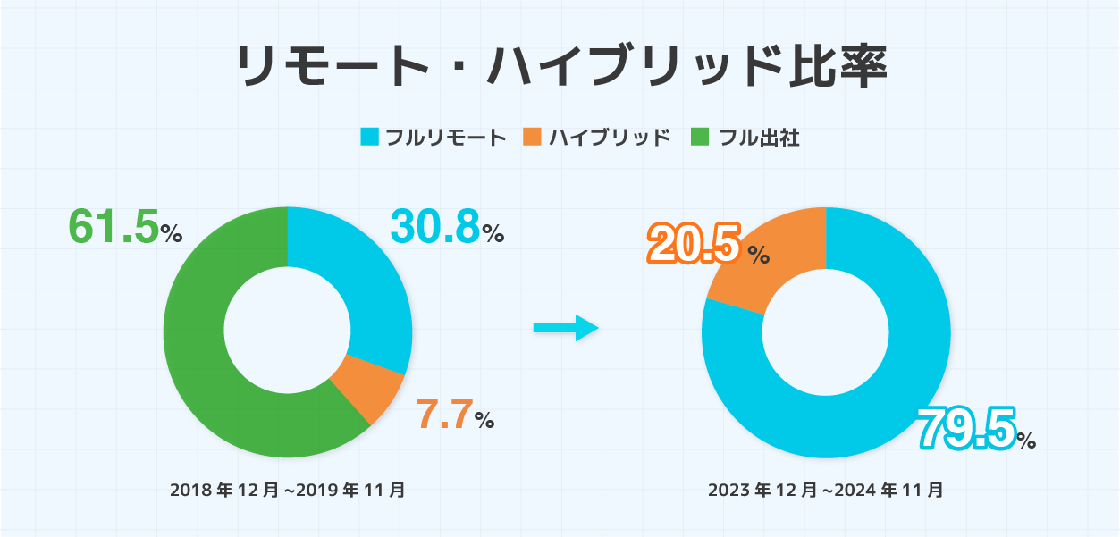リモートワークを基本としつつも、ハイブリッドやフル出社など多様な働き方を取り入れており、この変化が前述の居住地の広がりにもつながっています!