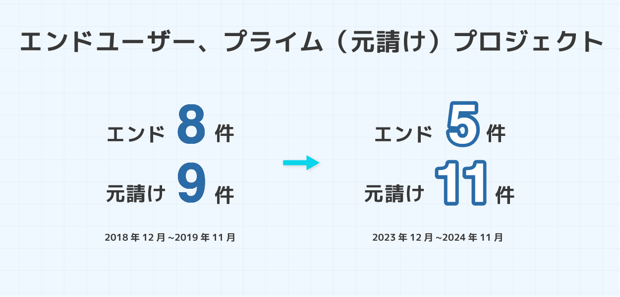 JOINT CREWでは、もともと社員が参画するプロジェクトの多くがエンドユーザーや元請け企業との直接契約でしたが、近年ではチームとして成果が出せる傾向が強い元請け企業の契約が増加しています。