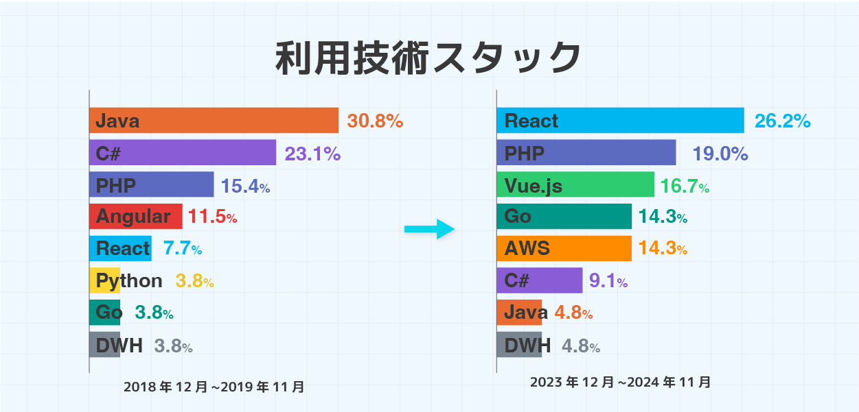 データを見ると、この5年間で活用される技術のトレンドが大きく変化していることがわかりますね。