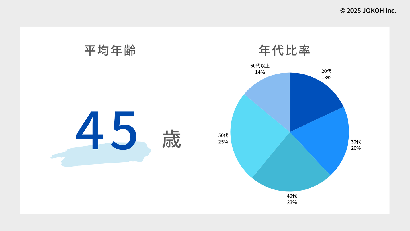 平均年齢は45歳。もっとも多いのは50代(25%)ですが、20代〜30代も4割近くおり、幅広い世代が活躍中です。年代が異なるからこそ生まれる気づきや学びがあり、多様性のあるチームが常光の強みになっています。