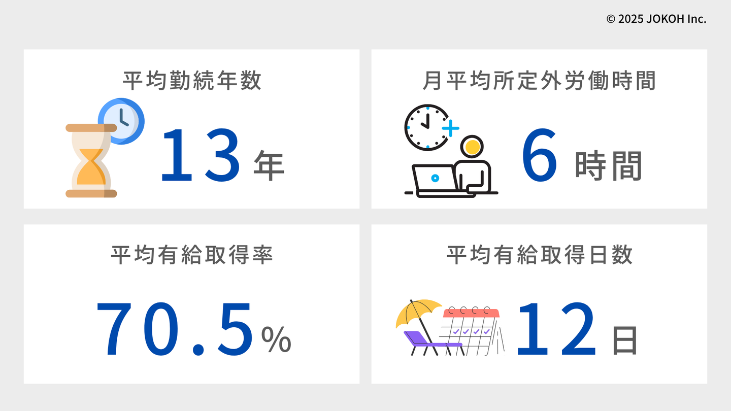 常光の特徴はなんと言っても勤続年数の長さ。平均勤続年数は13年と定着率の高さがうかがえます。もちろん時期によって繁閑の差はありますが、月の平均残業時間は6時間と少なめです。有給休暇の取得日数は平均12日、取得率は70.5%。政府が掲げる『令和10年までに取得率70%』という目標をすでに上回っています。社員が仕事と生活のバランスを大切にしながら働ける環境づくりを実現しています。
