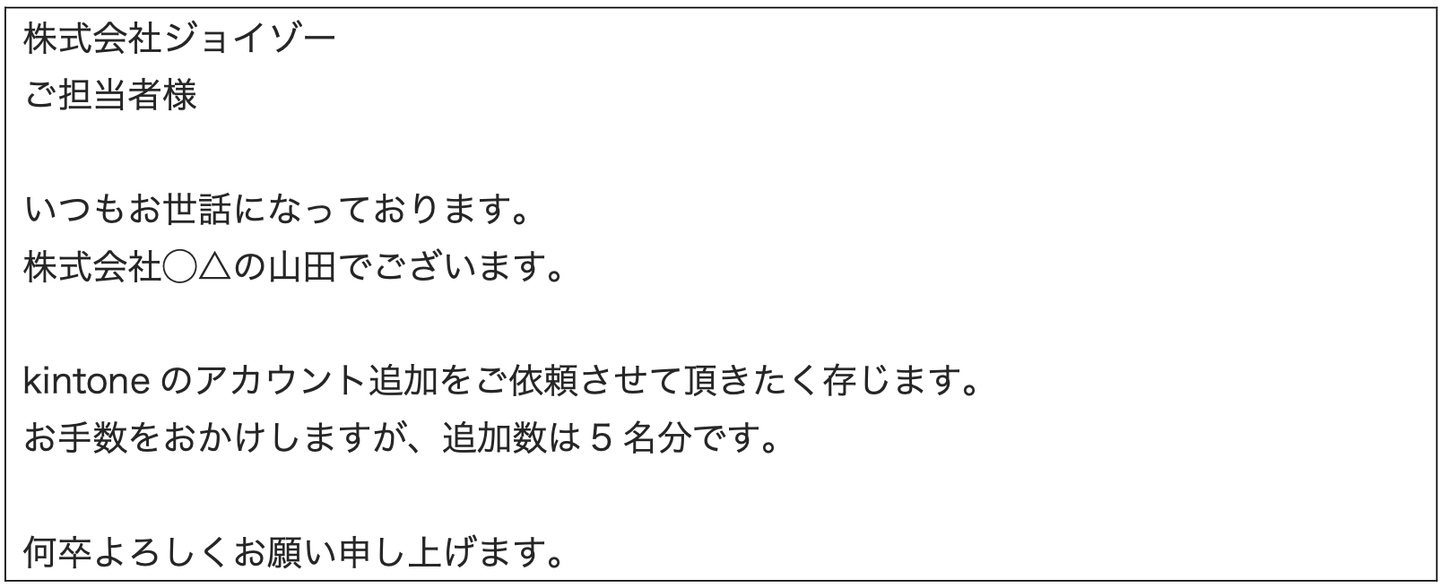 これはkintoneのゲストユーザーのアカウント数を追加してほしい、というお問合せメールの例です。