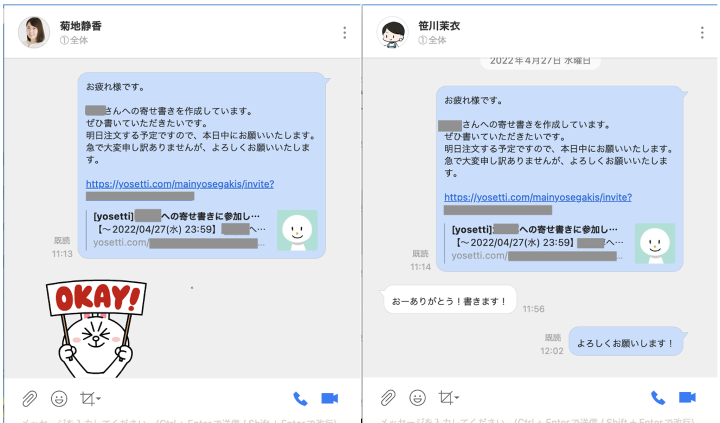 ↓ このように、LINEWORKSで一人一人にお声がけしました。