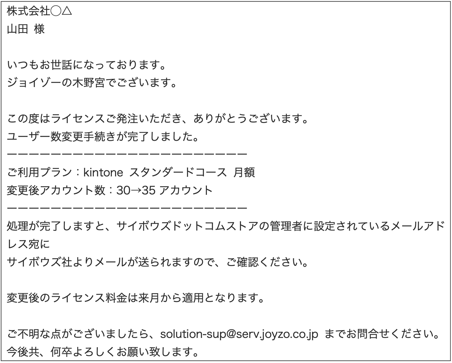 この返信メールも、ただ追加分の発注が完了したことだけを記載するのではなく、「ご利用プラン」や「変更後のアカウント数」を記載した方がわかりやすいから親切だと教えていただきました。