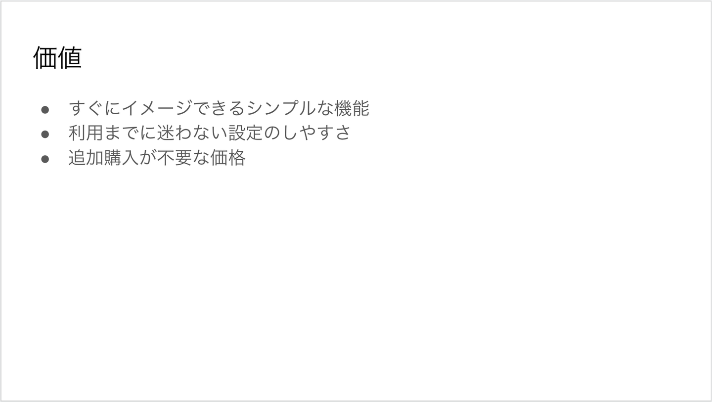 私は特にこの価値の部分で説明していただいた「すぐイメージできるシンプルな機能」「利用までに迷わない設定のしやすさ」という部分がまさに利用者の目線に立ったマーケティングだと思いました。実際に私もインターン生の時、何の知識もないまま「Joboco」を連携させたアプリを作りましたが、直感的に操作しやすかった印象が強くあります。製品を使っていただくお客様にストレスを感じさせないことで結果的に新規で契約していただいたり、長く製品を使っていただくという会社への利益が生まれるのだと学びました。