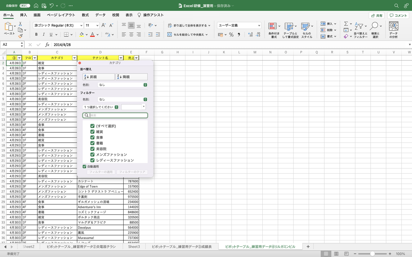 このように、大量のデータがあるときにチェックボックスや検索で絞り込むことができます。この機能を活用することによって、フロアごとの売上や日にちごとの売上などが確認できます。大学時代はExcelを表作成に使う程度で、たくさんの情報を扱ったことがなかったので知らなかった機能でしたが、ぜひ今後も使ってみたいと思いました。